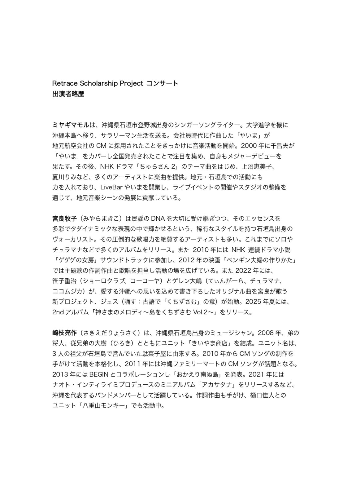 ミヤギマモル、 宮良牧子、 崎枝亮作のコンサートを行います。