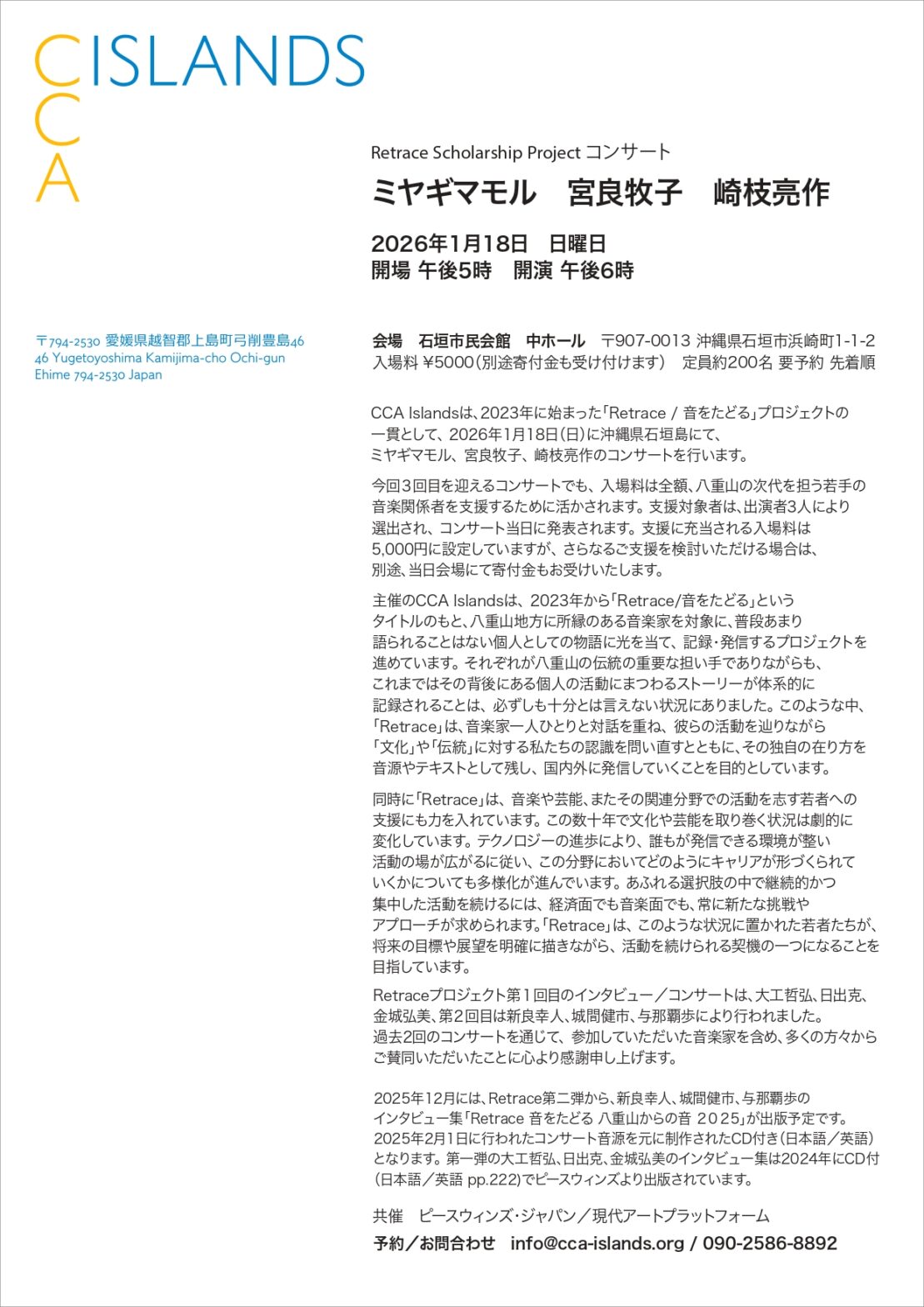 予約: info@cca-islands.org / 090-2586-8892